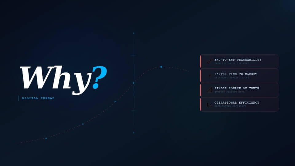 The purpose of a Digital Thread is to connect the multiple nodes in an organization to enhance collaboration and communication. Digital Threads are helpful in breaking silos and making relevant information available to all departments and functions. A holistic view of all process means that enterprises have actionable insights into:
