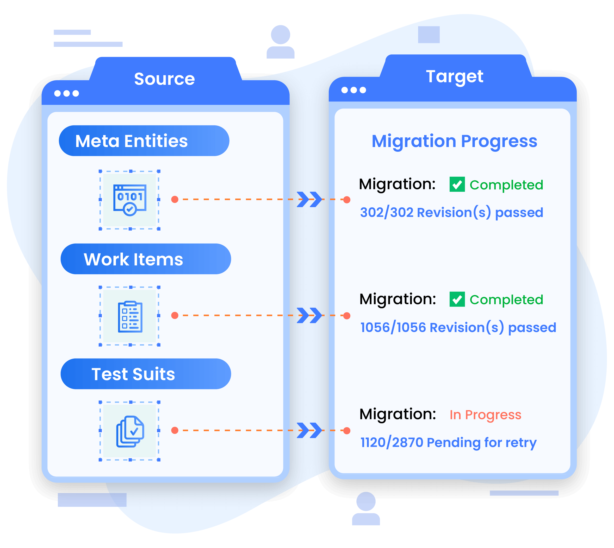 Migrates work items and test entities including Test Cases, Test Suites, Test Plans, Test Runs, and Results
